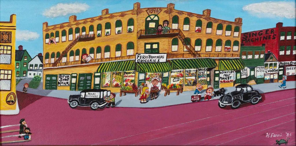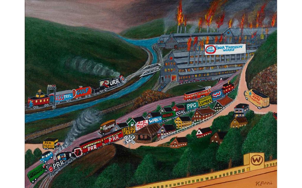 Kathleen Ferri first picked up a paintbrush at 58 years old. Now 95, her “memory scenes” will be collectively on view for the first time—including a number of paintings that will also receive a public debut. Kathleen’s work preserves the small-town streets of her childhood with an intuitive sense of history and the warmth of sentiment. They radiate with color and burst with joy as expressive figures make their way through downtown Turtle Creek, riverside mills, Kennywood heritage days, and more. See the Mon Valley as few have in this career retrospective, presented by Rivers of Steel and augmented with archival artifacts from the organization’s collections. Memory Scenes: A Kathleen Ferri Retrospective is curated by Barbara L. Jones, chief curator at The Westmoreland Museum of American Art, and Ron Baraff, director of historic resources and facilities for Rivers of Steel.