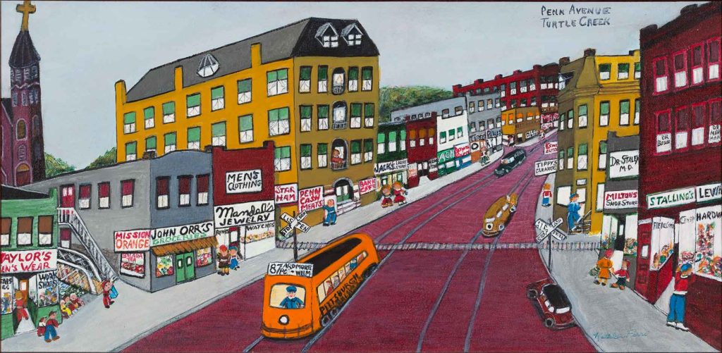 In this solo show, 57 of Ferri’s paintings are on view as a collection for the first time—including many that are receiving their public debut. They radiate with color and burst with joy as expressive figures make their way through downtown Turtle Creek, riverside mills, Kennywood heritage days, and more.